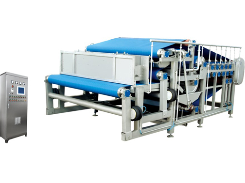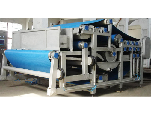Belt-type press machine is made of stainless steel rack, press section,driving unit, the belt tensioner device, belt correction system, collecting plate and discharge pipes, electric control system etc. The devices adopt stacking rollers structure, it can continuously auto feeding, squeezing,filter cleaning and discharging residue etc. And it can separately collect the raw liquid and filter cleaning liquid.