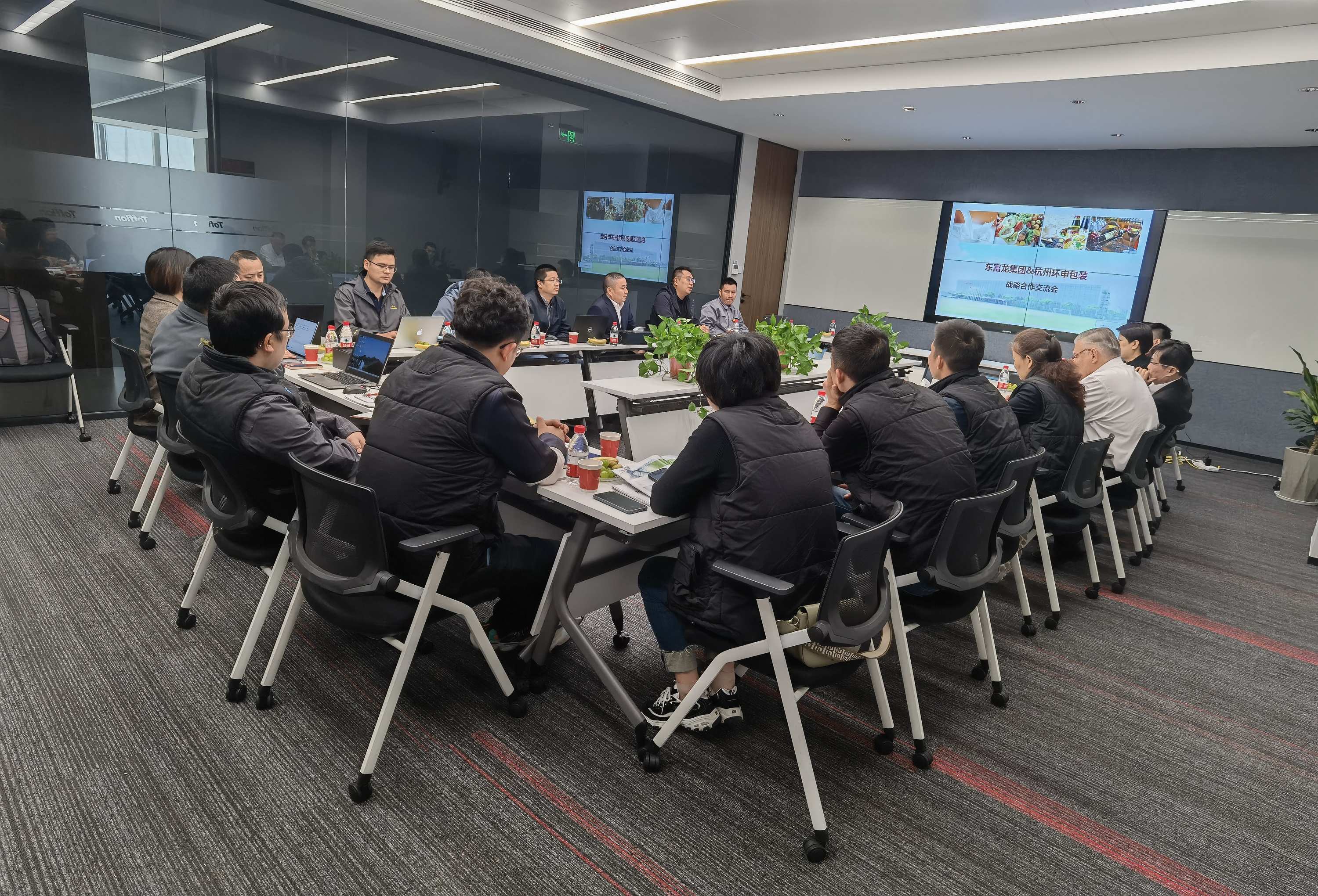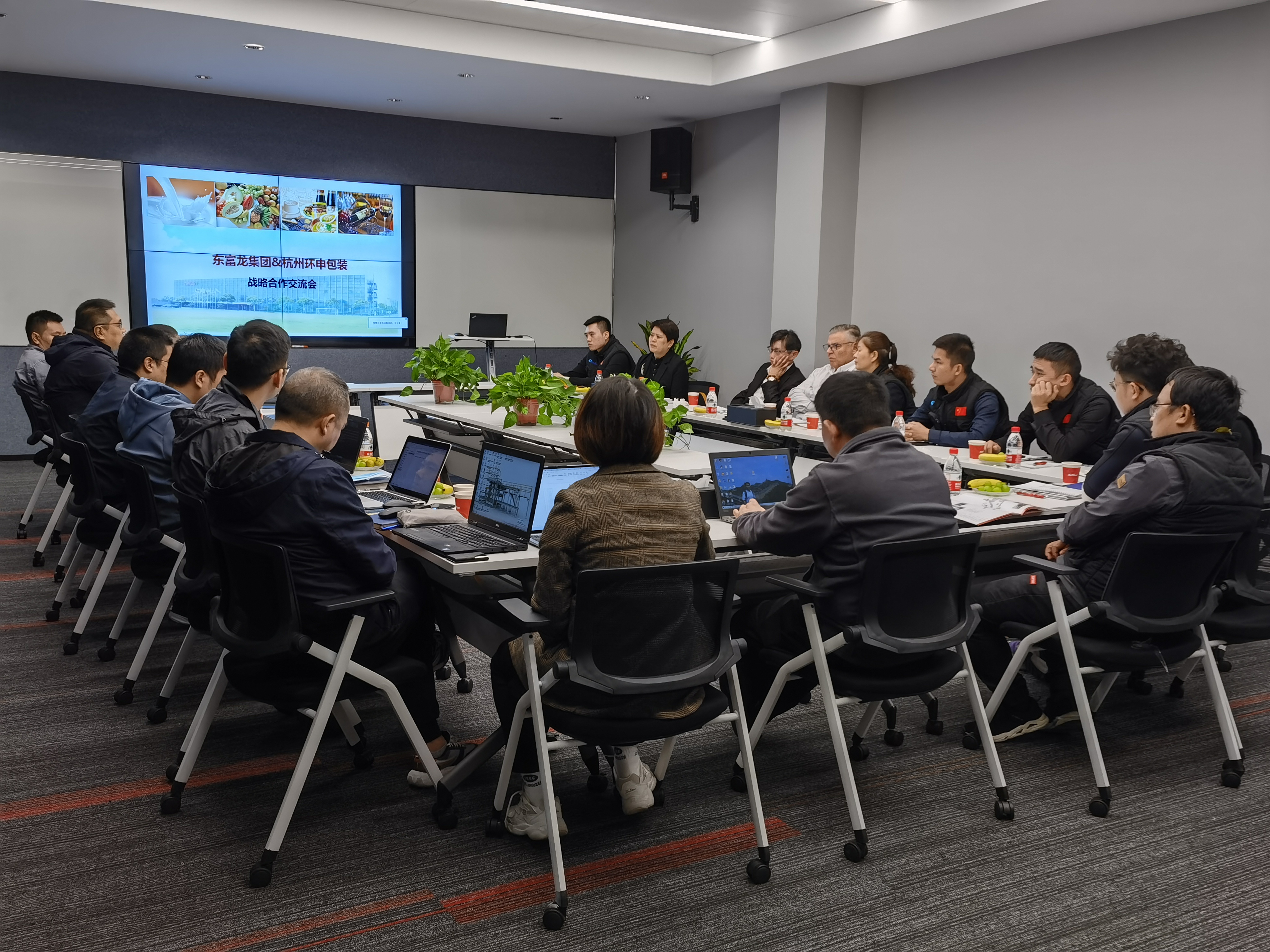 東富龍食品工程事業(yè)部,專注于液態(tài)食品加工關鍵技術及核心工藝的研發(fā),提供從原料處理、產品灌裝到后道包裝一站式服務。制造研發(fā)的無菌殺菌灌裝系統擁有10多項專利技術,與環(huán)申新材的無菌袋產品有著緊密的適配關系。會議期間,雙方技術與銷售對全球液態(tài)行業(yè)無菌袋市場進行分析,共同探討了飲料無菌處理、殺菌灌裝和包裝的關鍵技術,尋找最佳的工藝處理及包裝解決方案,共話發(fā)展新思路與新方向,并達成了強烈的戰(zhàn)略合作共識,力求實現綠色智能制造與綠色包裝的共享共贏。