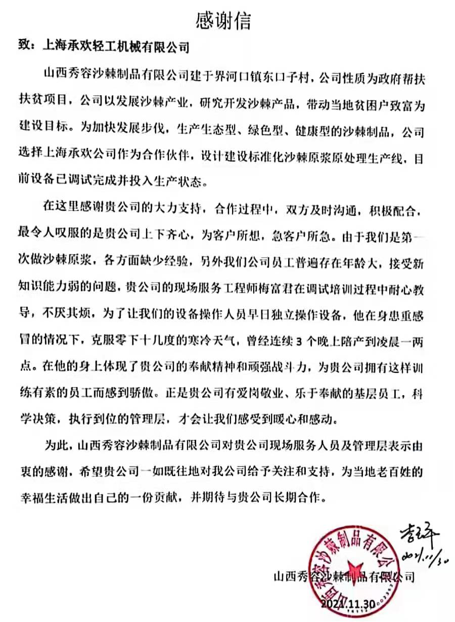 近日,我司收到山西秀容沙棘制品有限公司發(fā)來的感謝信。信中高度贊揚了我司現(xiàn)場服務(wù)工程師梅富君專業(yè)務(wù)實、勤奮敬業(yè)的服務(wù)精神,并對項目實施團隊及管理層的支持及協(xié)助表示感謝。