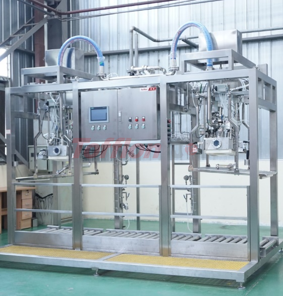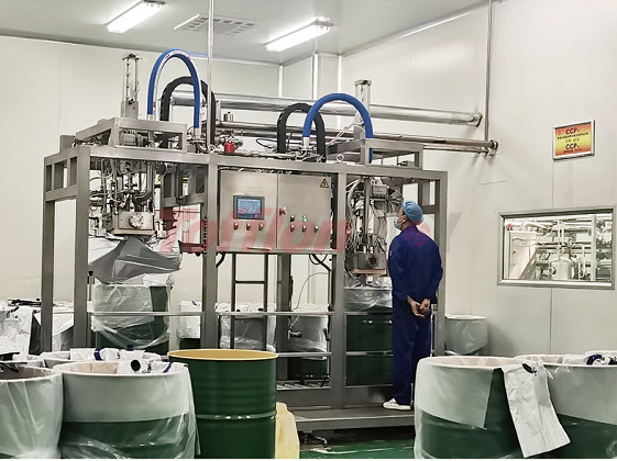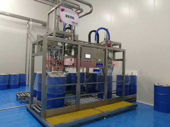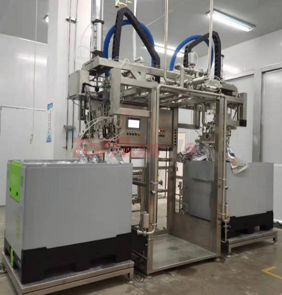 灌裝過程中,對袋口進行兩次蒸汽噴射。在無菌環(huán)境中,經(jīng)過殺菌的物料,通過流量計或者電子稱計量,灌進無菌袋中。