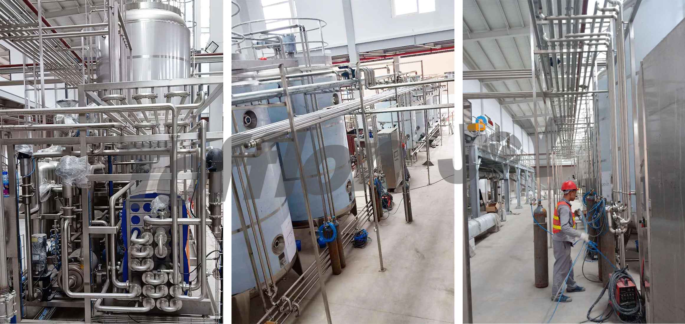 現(xiàn)該項(xiàng)目現(xiàn)已進(jìn)入安裝調(diào)試尾聲階段,即將投入實(shí)際大生產(chǎn)。該生產(chǎn)線關(guān)鍵部分全部采用先進(jìn)的配置保證生產(chǎn)線連續(xù)穩(wěn)定運(yùn)行,例如,杯式榨汁機(jī)采用西班牙佛美莎品牌,殺菌機(jī)換熱器機(jī)組采用瑞典利樂(lè)進(jìn)口配置,全自動(dòng)CIP清洗系統(tǒng)配置等等。