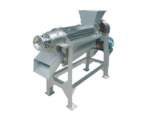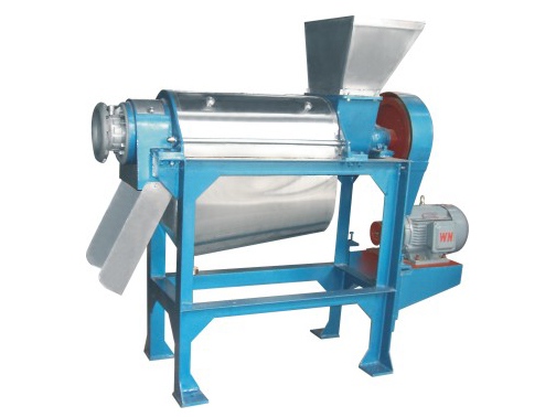 本設備的主要構件是螺旋,螺旋沿著料渣出口方向底徑逐漸加大而螺距逐漸減小,當物料被螺旋推進時,因螺旋腔體積的縮小,形成對物料的擠壓而榨汁。原料加入進料斗中,在螺旋的推進下受壓,其壓榨的汁液通過過濾網流入底部的盛汁器,而廢料則通過螺旋及調壓的錐形部分之間形成的環狀空隙排出,調壓頭沿軸向的移動可調整空隙的大小,調整出汁率。