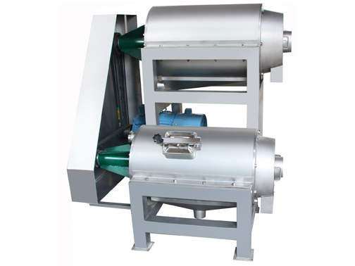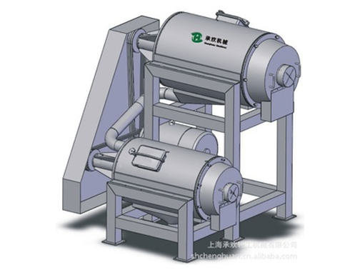 物料進入頭道物料桶內,主軸帶動葉輪高速旋轉,物料被葉輪帶動與篩網摩擦擠壓,使得果肉,汁與皮、核、籽分離。肉和汁通過篩網上的小孔進入二道物料桶內,皮和籽則向軸端推進經過排渣口排出,二道物料桶結構與頭道相同,只是二道篩網網眼直徑小,主軸轉速高。
