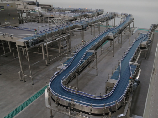 輸送線主要是完成對物料的輸送任務,是連接各生產設備的橋梁,輸送路線可為直線、曲線和傾斜輸送。根據不同的輸送物料,進行靈活組合和設置,已達到對玻璃瓶、易拉罐、PE瓶、PET瓶等產品的輸送任務。