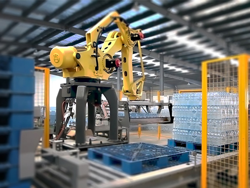 機(jī)器人碼垛機(jī)可以集成在任何生產(chǎn)線中,為生產(chǎn)現(xiàn)場提供智能化、機(jī)器人化、網(wǎng)絡(luò)化,可以實現(xiàn)啤酒、飲料和食品行業(yè)多種多樣作業(yè)的碼垛物流,廣泛應(yīng)用于紙箱、塑料箱、瓶類、袋類、桶裝、膜包產(chǎn)品及灌裝產(chǎn)品等。配套于三合一灌裝線等,對各類瓶罐箱包進(jìn)行碼垛。